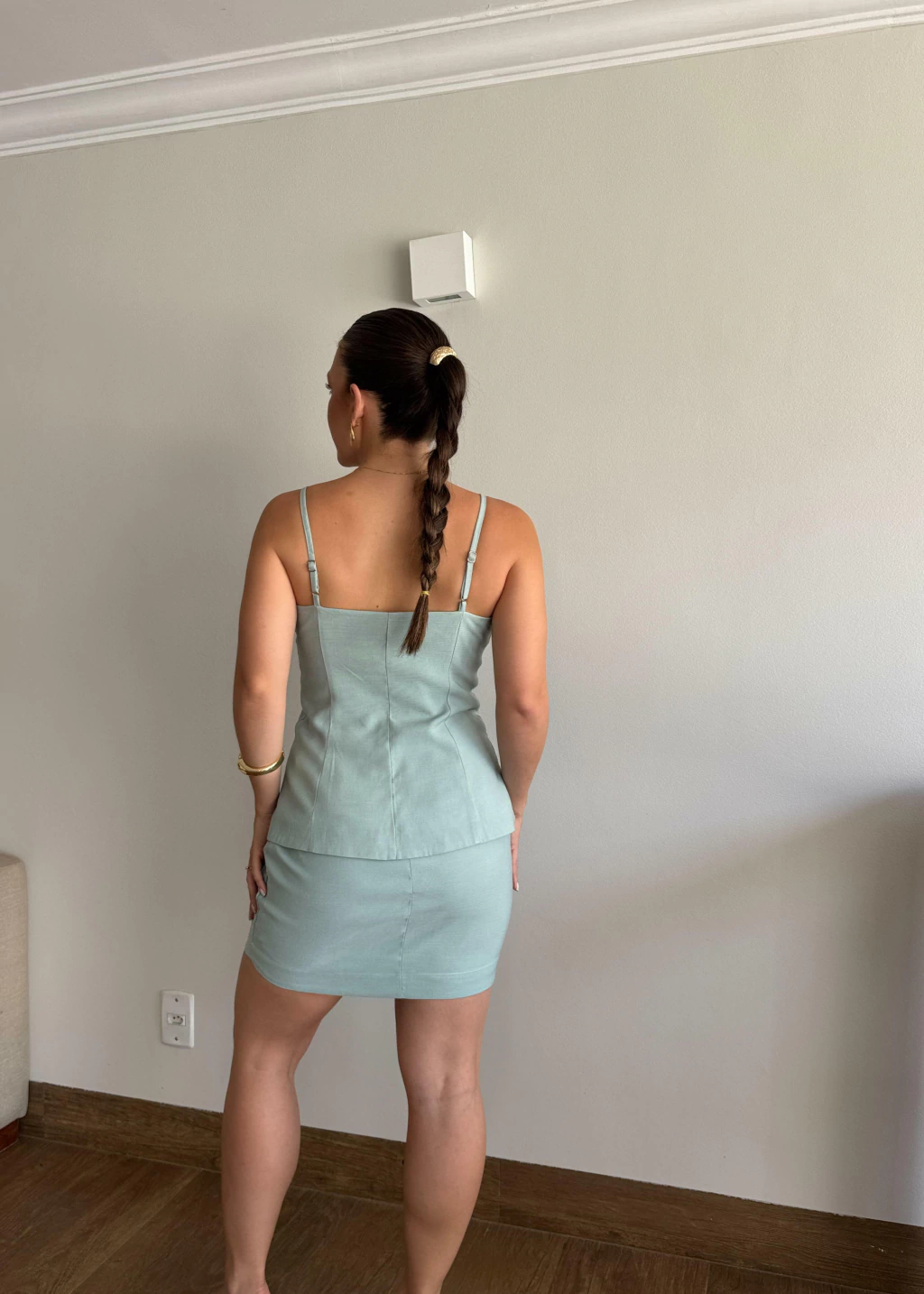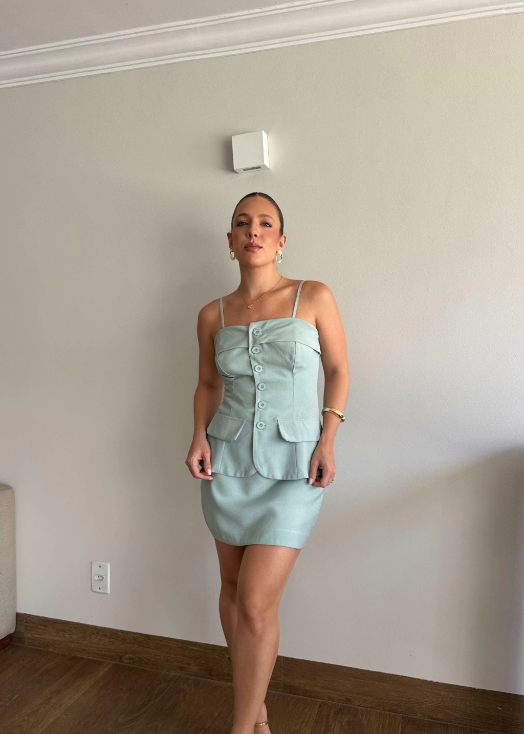 Decote reto com debrum no mesmo tecido, valorizando o colo com elegância