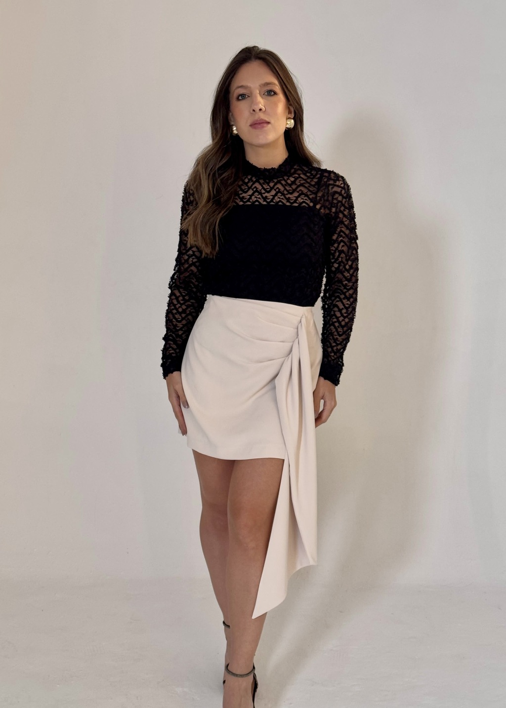 BLUSA DE MANGA LONGA NO TECIDO DE RENDA E TESTURIZADO.